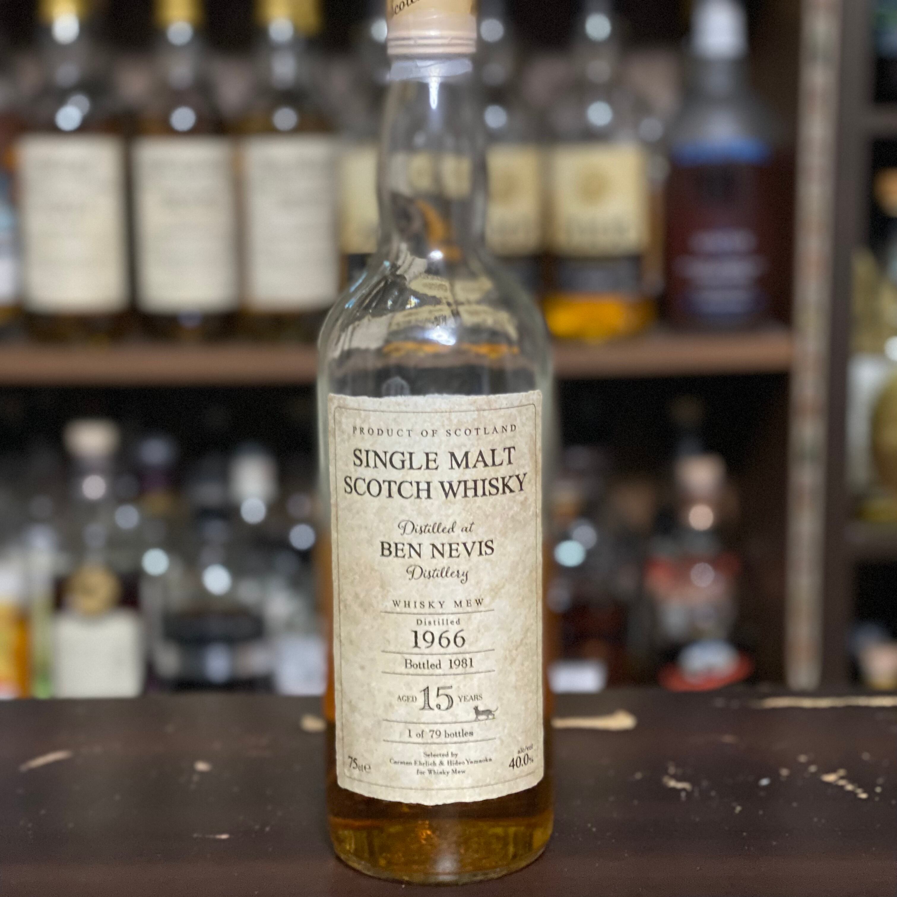 今回、WHISKY MEWからリリースするのはニッカが買収するより以前の「ベンネヴィス1966」。保管されていた外箱や梱包状態などから、1966年に蒸溜されたシングルカスクで、15年の熟成を経て1981年にボトリングされたものであることがわかりました。